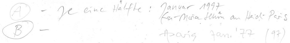 1997 entwickelten die Künstlerin Eva-Maria Schön und Heidi Paris zwei Leporelli im Format 35 x 200 cm. Das obere Leporello (A) wurde von Eva zur Hälfte begonnen und von Heidi fortgeführt, das untere (B) umgekehrt.